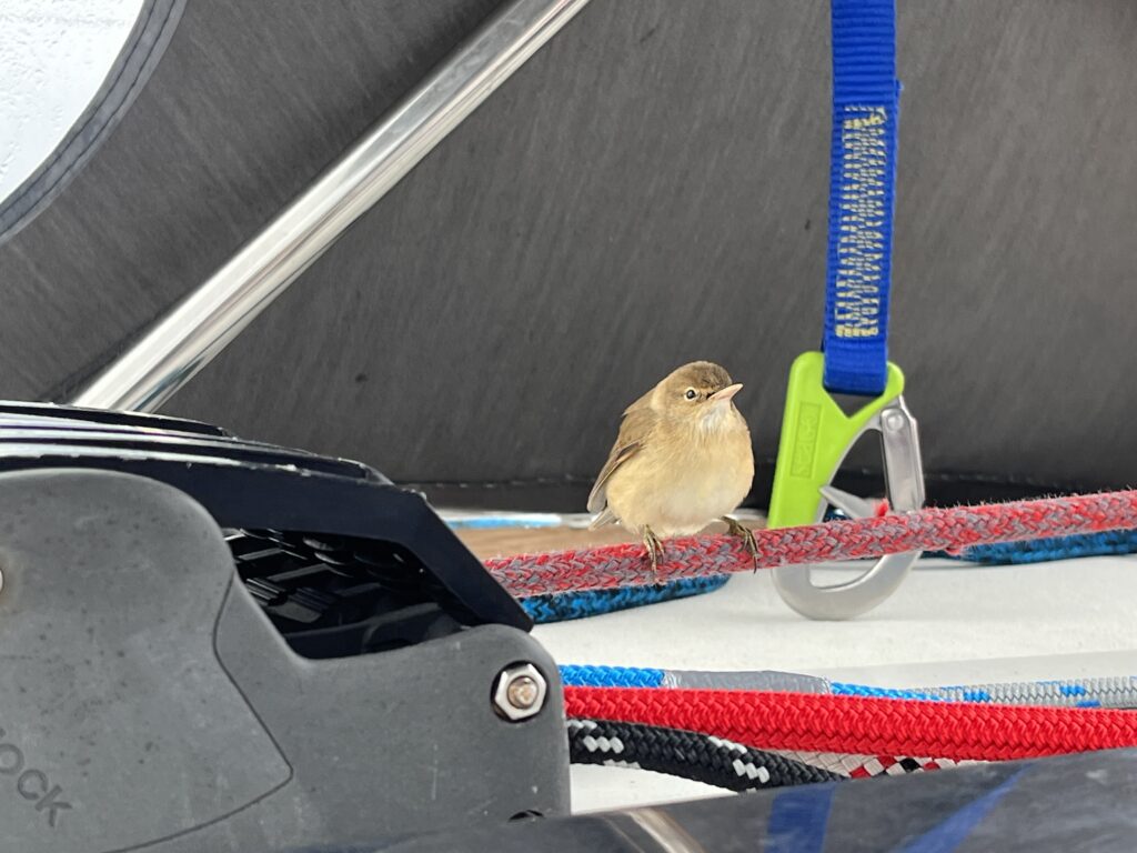 Onderweg hebben we bezoek gekregen van een vogeltje dat behoefte had om te schuilen en uit te rusten. Na wat slaap ingehaald te hebben heeft dit vogeltje zich tegoed gedaan aan alle spinnetjes die zich aan boord bevonden en is weer uitgevlogen.